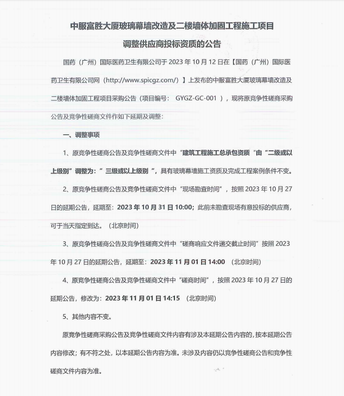 【公告】中服富胜大厦玻璃幕墙改造及二楼墙体加固工程施工项目调整供应商投标资质的公告